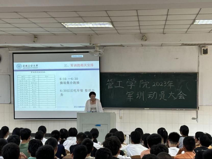 2023级新生军训动员大会在东阶101举行。2023级新生辅导员刘瑜、曹宇及2023级全体新生参加大会。