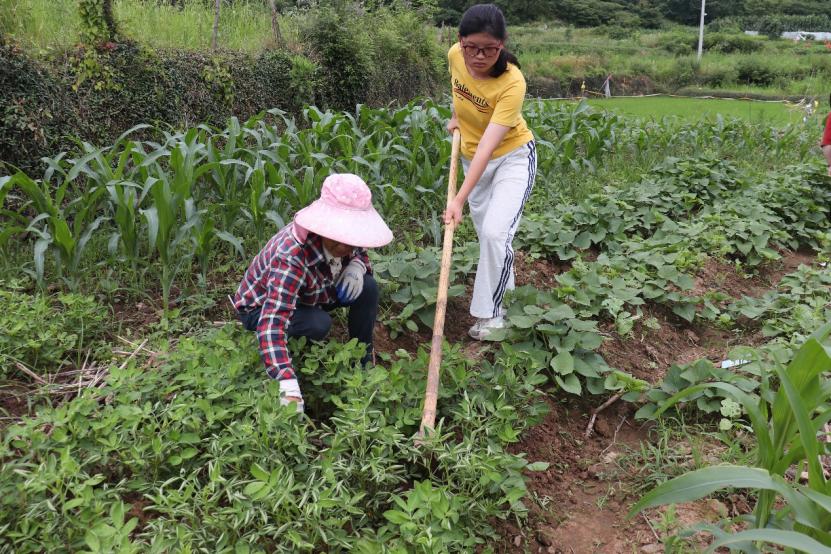 那位村民非常热情地邀请我们去看看她家的玉米地,汪敏说:“走吧,带你们体验一下村民的日常生活。”接着我们就跟着村民去到了田地里,我们几个实践队员大多数也都是农村出来的,看到这个场景自然也就按耐不住了,挽起袖子就上去帮忙,锄地的锄地,拔草的拔草。