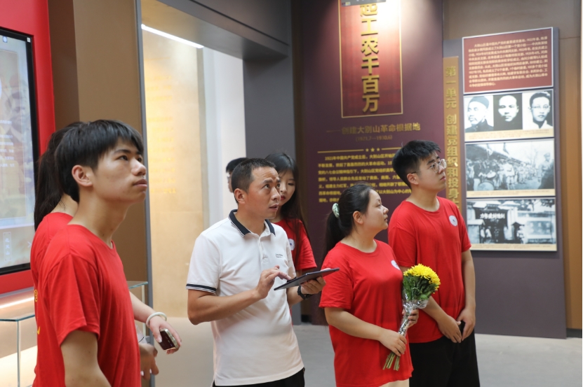 图为大别山烈士陵园管理所所长蒋结华在大别山烈士陵园纪念馆内向社会实践队员讲解革命历史事件