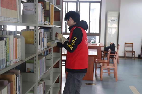 伴随着早晨的阳光,志愿者于图书馆门口集合,细心耐心做好整理工作。入馆后,图书馆负责人尹老师对志愿者进行指导与任务安排,志愿者共分为两组进行活动,一组负责清洁图书馆书架,擦拭落灰,给书籍更好的存放环境;另一组负责整理图书,使图书的摆放更加整齐有致,易于找寻。在志愿者的互相配合与共同努力下,任务圆满完成。