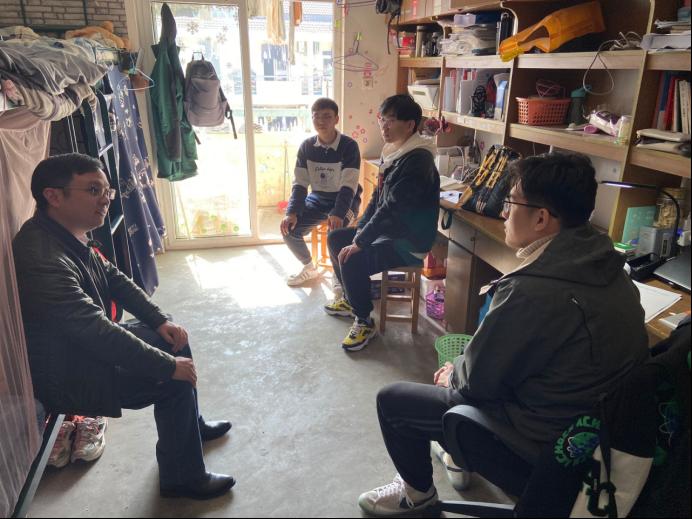 党政领导走进宿舍看望慰问考研学子,发放营养牛奶及考研文具包,送上学院的关心与祝福。院领导汪春胜、汪和平、王功成、郜振华、王付宇以及毕业班辅导员赵玉婷分组深入宿舍、看望考研学生。