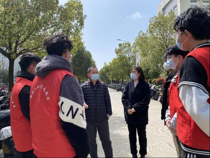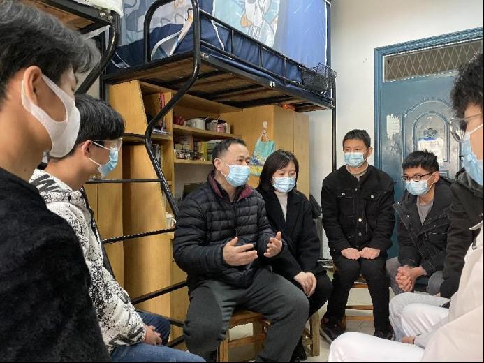 疫情封闭下的校园,虽有些许寒意,但依旧温暖。自疫情以来,学校、学院值班留守领导一直奋战在前线,用心坚守,用爱守护,把初心和使命镌刻在抗疫行动中。学工部部长何伟一行,为学院学生们、辅导员们的学习、工作情况排忧解难;学院党委书记汪春胜、副处级辅导员赵颖心系学生,深入一线走访学生宿舍。他们耐心调研学生线上上课、网络保障、生活物品、餐饮服务等方面的情况,及时为同学们出谋划策;他们悉心叮嘱同学们要认上好课,多运动,保证良好的学习和生活状态;他们用心倡导同学们不网购、不点外卖,保持宿舍清洁卫生,严格遵守疫情防控期间学校的各项管理规定。