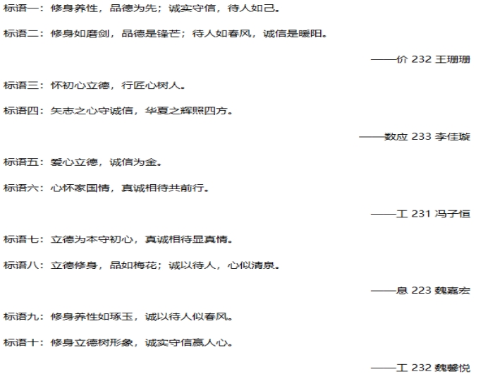 通过本次的诚信主题的标语收集活动,强化了学院学生的诚信知识和诚信意识,也为学院学生品德修养、能力发展提供了实践锻炼的机会。诚者,天之道也;思诚者,人之道也。相信学院的学子们将在以后的学习生活中秉持诚信准则,积极践行“立德修身,诚以待人”精神,争当新时代的好青年。
