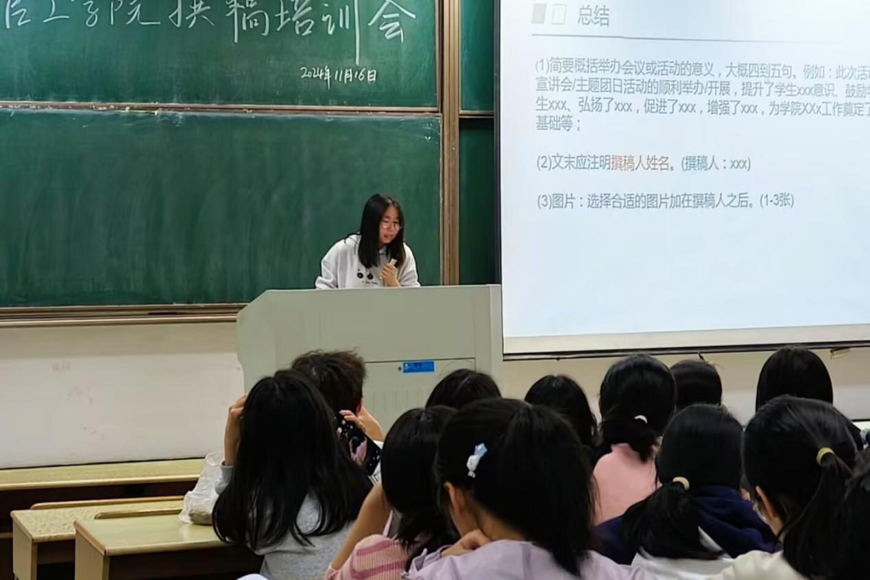 会上,司佳妮采用视频、范例、现场提问等多种形式,对新闻稿撰写技巧进行了系统讲解。她详细阐述了新闻稿的四大基本构成——标题、导语、正文和结语,着重强调了新闻稿撰写中需遵循的格式规范、语句要求以及客观严谨的写作态度。同时,她还结合实例,指出了新闻稿撰写过程中常见的错误及修正方法,明确了稿件撰写的具体要求和信息查找的有效途径。培训过程中,同学们认真听讲,踊跃发言,积极互动,分享撰稿心得,相互启发。