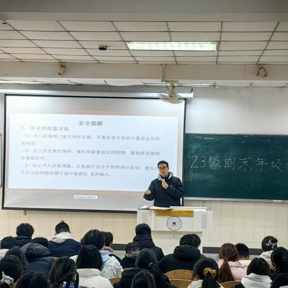 会上,曹宇引领2023级学生回顾梳理过去一年成长历程,对在学习、社会实践、校园文化建设等方面突出的先进个人和集体进行了表扬。接着,曹宇以案示警,讲述考试违规违纪等不诚信行为的危害,引导学生积极复习备考,组织各班同学签署“诚信考试承诺书”,呼吁全年级坚守诚信、杜绝作弊。诚信教育结束后,曹宇围绕寒假交通安全、消防安全、食品安全、预防网络诈骗等方面,结合具体事例,引导学生守好安全最后一班岗,增强自我保护意识。最后,曹宇指出大二学年是承上启下,“探寻方向、明晰未来”的关键阶段,鼓励同学们利用寒假期间,明确个人目标,提升专业能力,熟虑规划前程,为未来职业发展打下坚实的基础。