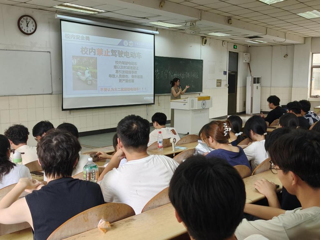 会上,孙如梦以“回顾暑假、安全教育、学习生活、展望未来”为主线带领同学们复盘假期生活,鼓励大家将假期见闻与社会实践经历转化为成长动力;同时结合班级学风建设与学生综合素养提升需求,强调大二是学业深耕的关键阶段,提醒同学们快速调整状态,尽早回归高效学习节奏,会前,孙如梦对新加入管工学院即转专业的同学表示热烈欢迎,期待他们在学院绽放光彩。李军慧则围绕“安全守护”与“学业护航”两大核心重点展开细致讲解。在安全方面,结合“虚假考证培训”“冒充公检法”“刷单返利陷阱”等电信诈骗案例,叮嘱同学们提升自我防护意识;同时明确“纪律是校园安全与日常秩序的重要保障”,引导学生自觉遵守校园各项规章制度。在学业诚信方面,强调考试作弊“零容忍”的纪律红线,特别提醒挂科同学重视补考,主动梳理知识薄弱点、制定复习计划,确保顺利完成学业进度。