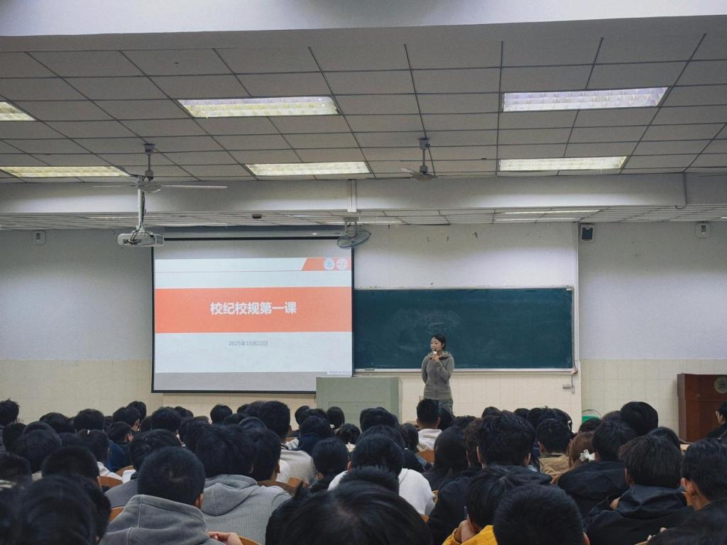 于10月22日在阶教201举行2025级新生“校纪校规第一课”。辅导员李思雨担任主讲,全体2025级新生参加。