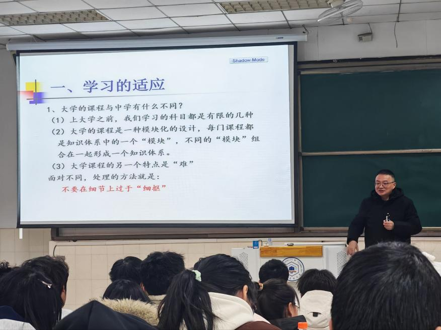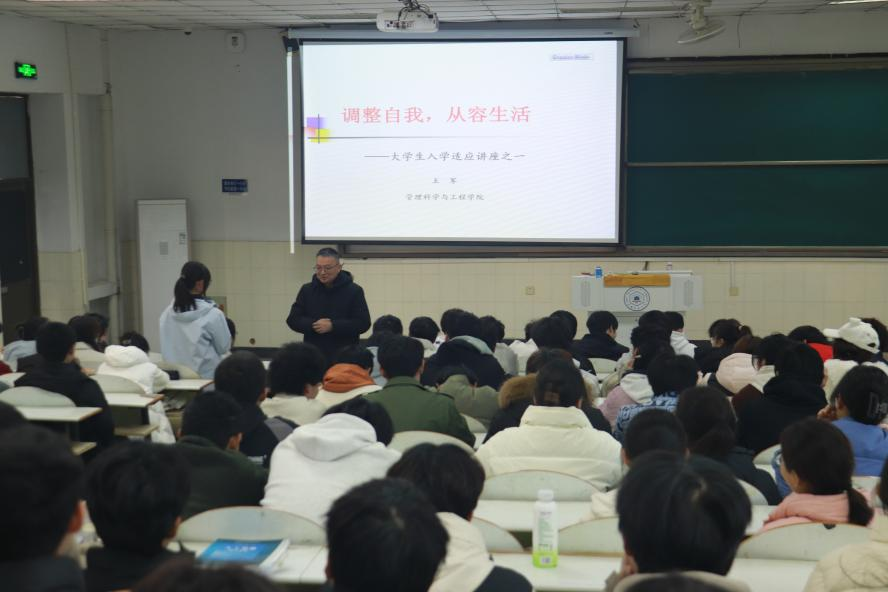 于阶教105举办《调整自我,从容生活》大学生入学适应讲座。学院党委书记王军主讲,2025级新生参与。