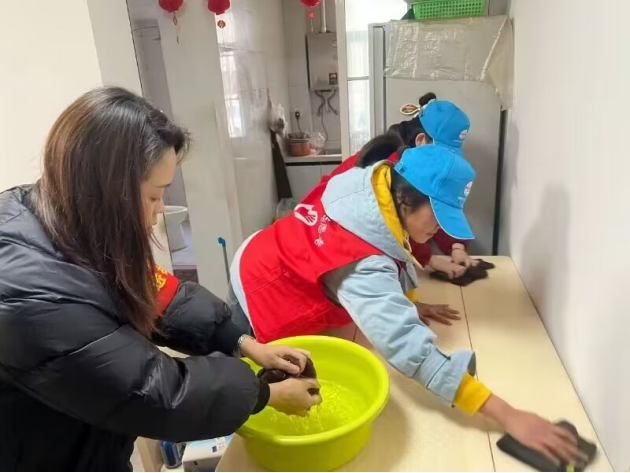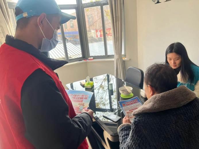 青年志愿者协会寒假实践队在马鞍山市江东街道金瑞社区、乔山社区与社区工作者一同拜访独居老人与残障人士,帮助他们清扫房屋,同时在小区内进行防范网络电信诈骗安全知识宣传。