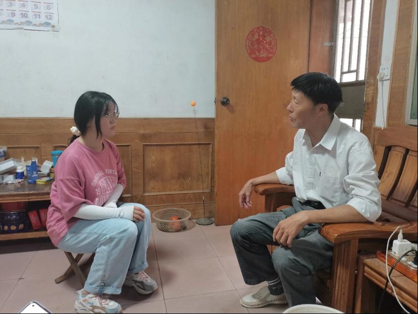 管工学院赴岳西重温大别山革命路线团队队长李焱娜在采访当地一位老党员。