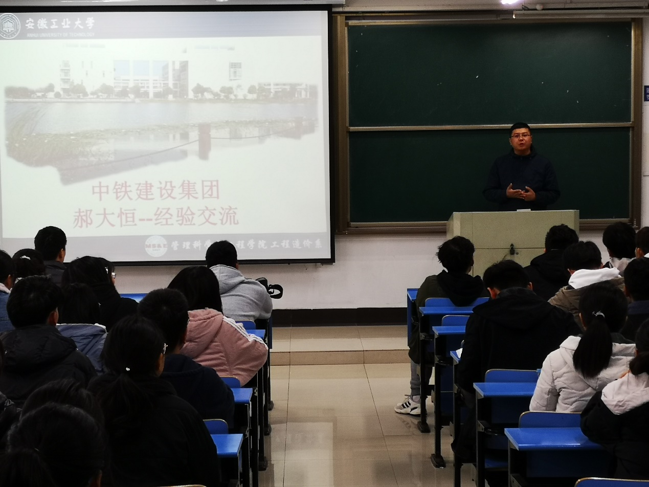 主讲人郝大恒经理凭借丰富的工程项目管理经验和阅历,围绕工程造价理论知识与实际操作等方面进行了讲解。郝经理首先介绍了工程造价的发展现状和发展趋势;其次结合中铁建设公司分析了工程造价专业的职业发展路径,并以实际案例向学生展示了工程造价具体业务情况;最后站在企业角度,讲解了企业对工程造价专业学生的能力需求,包括学习能力、适应能力、人际交流能力等。