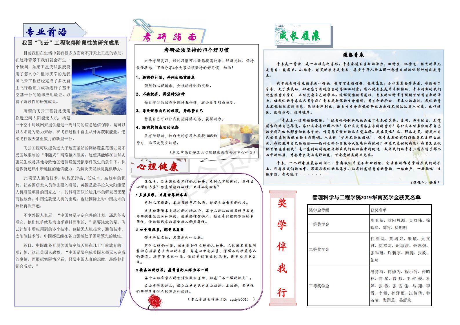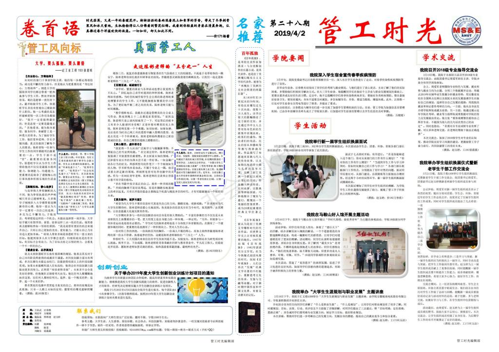管工时光为博彩 院报宣传平台,负责学院传统媒体报纸的编辑、策划与排版,与月刊、半月刊的形式对博彩 近期重大活动事件进行综合报道,同时根据国家实事推出专刊。特设诗话管工环节,鼓励学生原创诗歌投稿,激发学生创作热情。以下为管工时光第二十八期第一、二版: