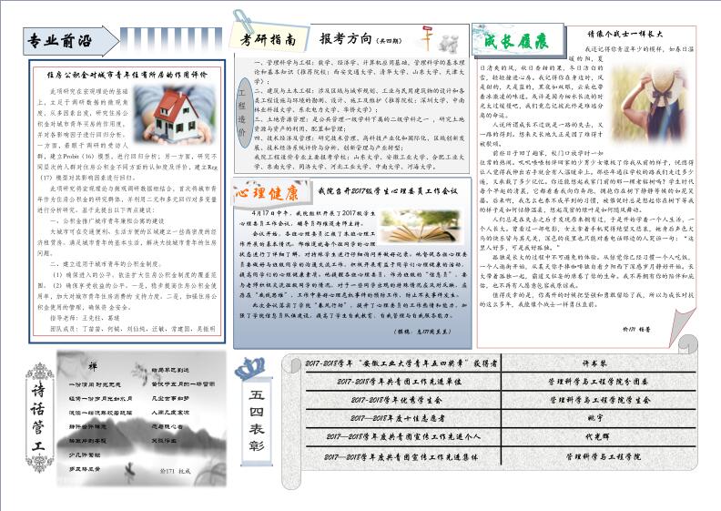 管工时光为博彩 院报宣传平台,负责学院传统媒体报纸的编辑、策划与排版,以月刊、半月刊的形式对博彩 近期重大活动事件进行综合报道,同时根据国家实事推出专刊。特设诗话管工环节,鼓励学生原创诗歌投稿,激发学生创作热情。以下为管工时光第二十二期第一、二版。