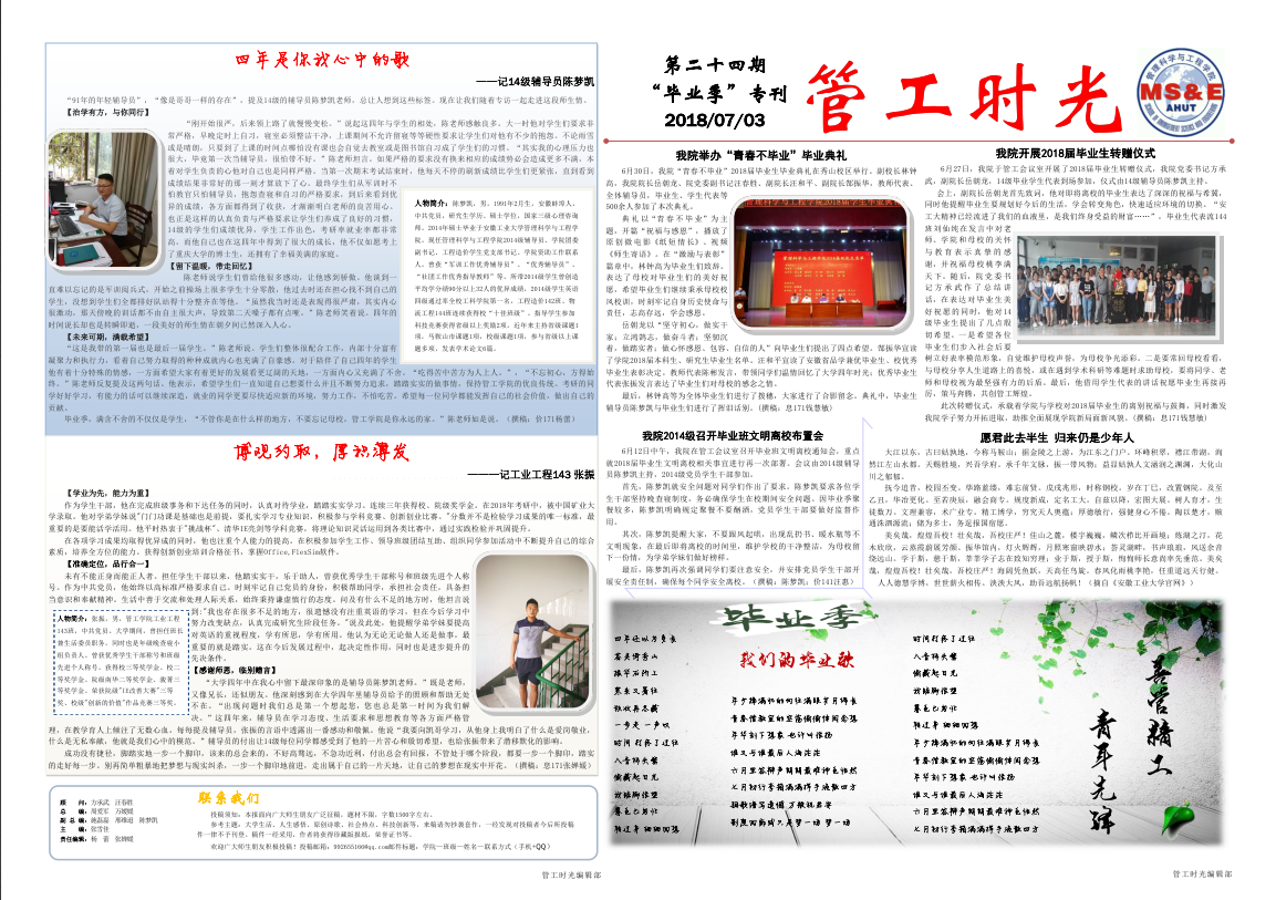 管工时光为博彩 院报宣传平台,负责学院传统媒体报纸的编辑、策划与排版,与月刊、半月刊的形式对博彩 近期重大活动事件进行综合报道,同时根据国家实事推出专刊。特设诗话管工环节,鼓励学生原创诗歌投稿,激发学生创作热情。以下为管工时光第二十四期第一、二版: